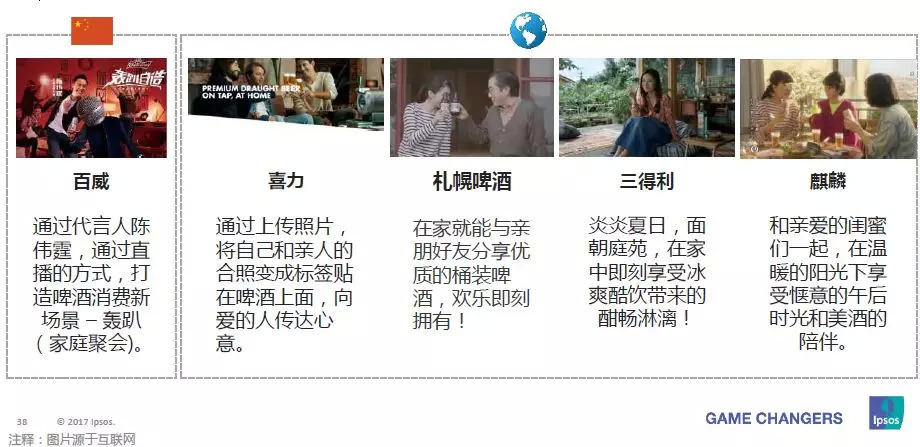 最大的消费场所是“家”,各大啤酒品牌尤其应该引起注意。目前,国内除少数品牌外(如百威),鲜有围绕以“家”为消费场所进行营销沟通,相比之下国外众多品牌都有过与家有关的表达。此外,啤酒厂商或许真的可以在啤酒外卖上下些功夫。