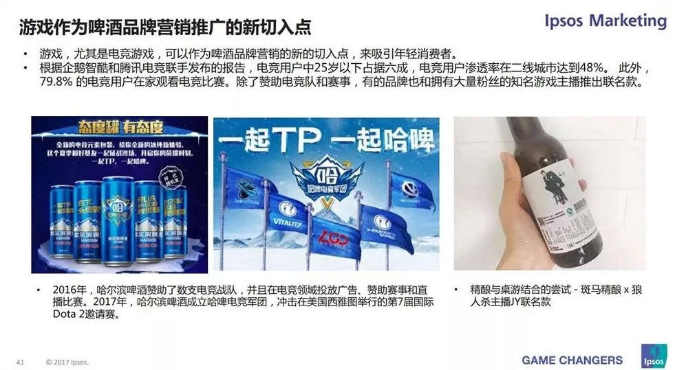 益普索认为,游戏,尤其是电竞游戏,可以作为啤酒品牌营销的新的切入点,以此吸引年轻消费者。