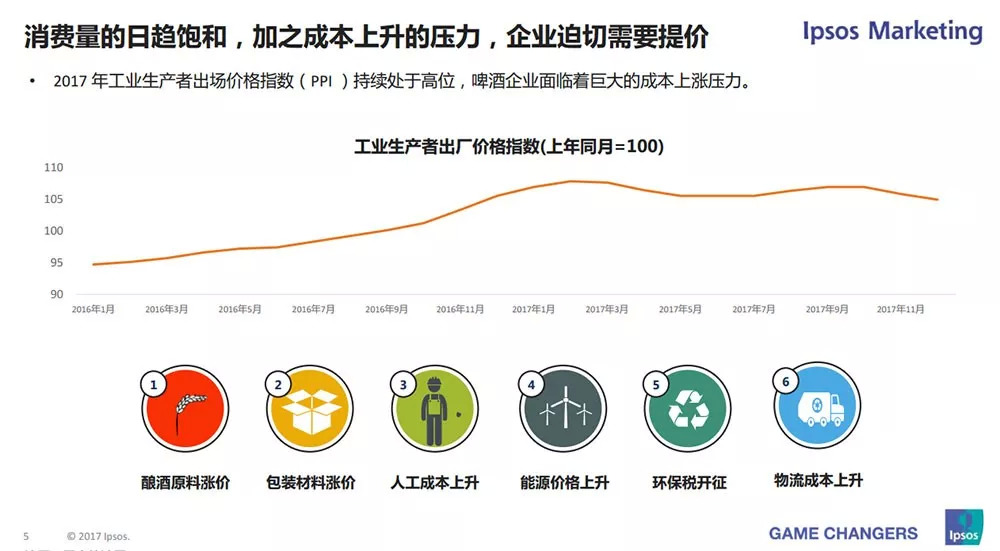 同时,从2016到2017,可以反应生产企业成本的“工业生产者出场价格指数(PPI )”大幅上涨,且持续处于高位,啤酒企业面临着巨大的成本上涨压力。