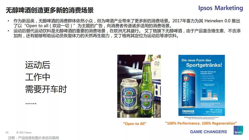 首先是无醇啤酒,这个比较小众的新品类最大的贡献在于带来更多新的消费场景。2017年喜力为其Heineken 0.0 推出了以“Open to all(欢迎一切)”为主题的广告,向消费者传递诸多适用的消费场景。