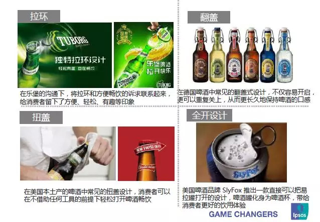75%的消费者看重这一点,在他们看来,无需开瓶器的拉环式的瓶盖和翻盖、可以旋转开的扭盖、喝着更舒服的全开设计,这些都将成为一瓶啤酒的加分项。