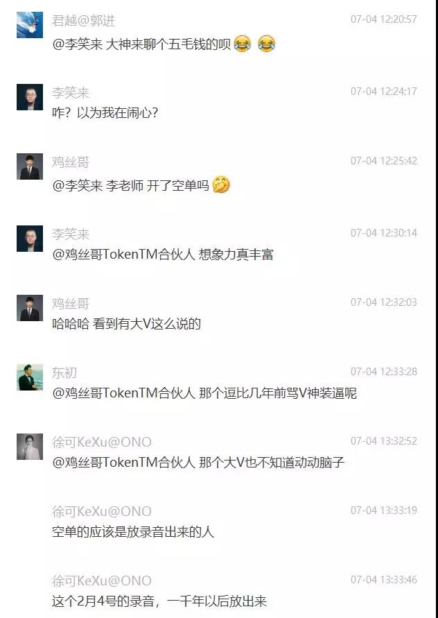 在李笑来录音里提及的量子链以及帅初等内容,帅初未回应任何内容,在量子链电报群里,很多人对这件事见怪不怪。社区里一个叫升月的网友发表看法说:“屁股决定立场,李笑来也就那么回事,所谓大咖,也许就是神棍。”