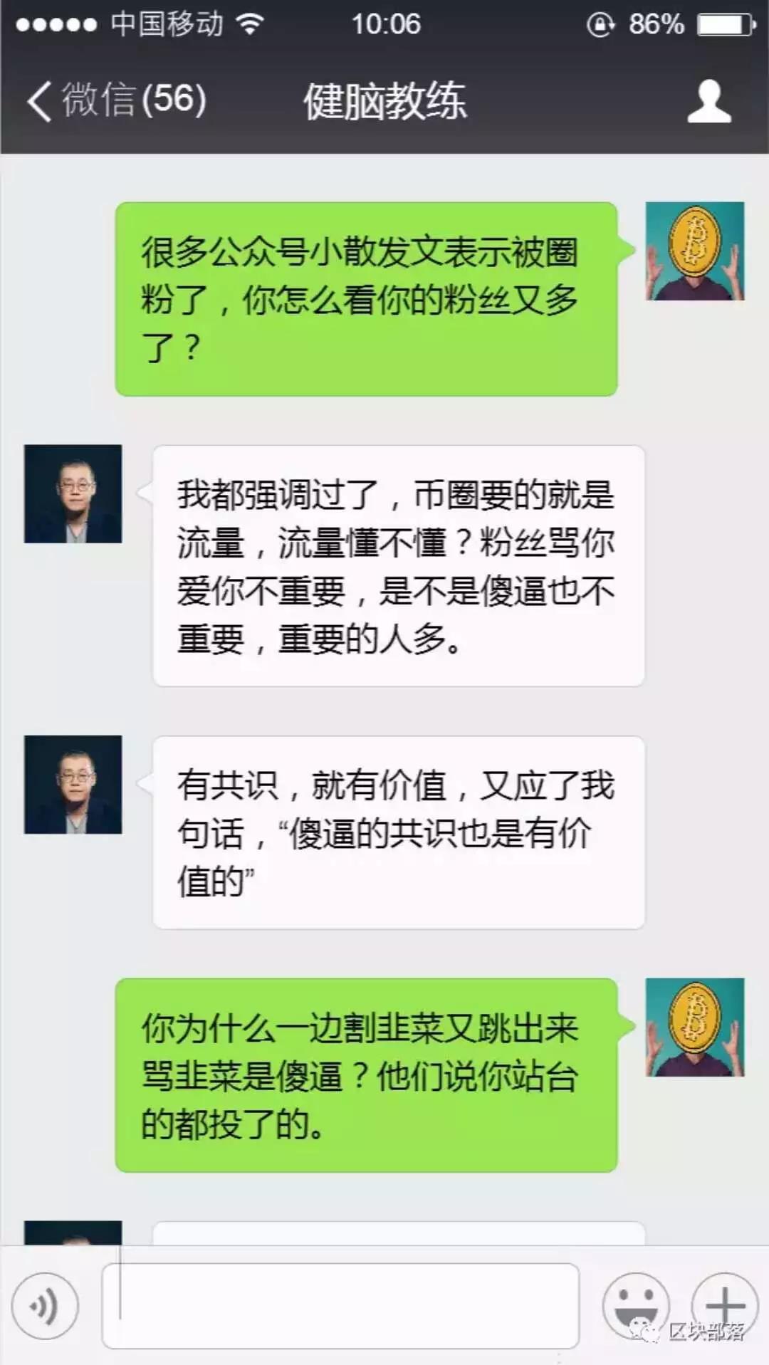 我不买币,我买了就屯着不动。我有一百万读者,一瞬间,就又爆发,熊市里,我写专栏,无法赚钱,就攒人气。大牛市来了,我影响力比原来还大。这个领域,核心竞争力是人流,高价值人流,这就是核心竞争力。