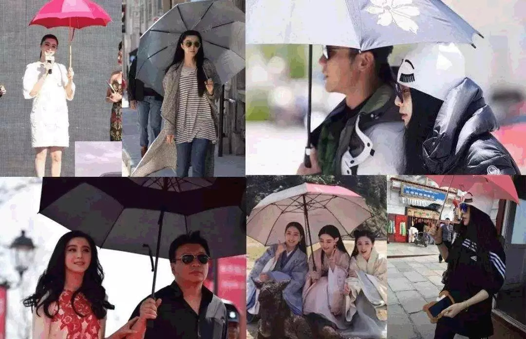 除了帽子,对于懒癌患者来说,出门随手就能抄上的一杆太阳伞也超级实用。美白小霸主冰冰范就是典型的伞不离手。网友做了一个“范冰冰和太阳伞”的合辑,可以说是很形象了。