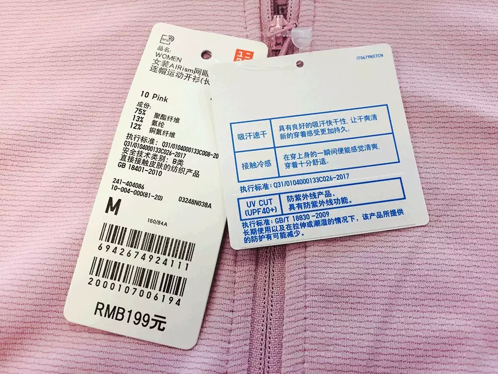 我们仔细研究了一下吊牌,发现优衣库的这款防晒外套竟然也是有通过国家UV检测,UPF达到40+。一个快时尚品牌竟然做出了一件真正具有紫外线防护效果的防晒衣!厉害了!