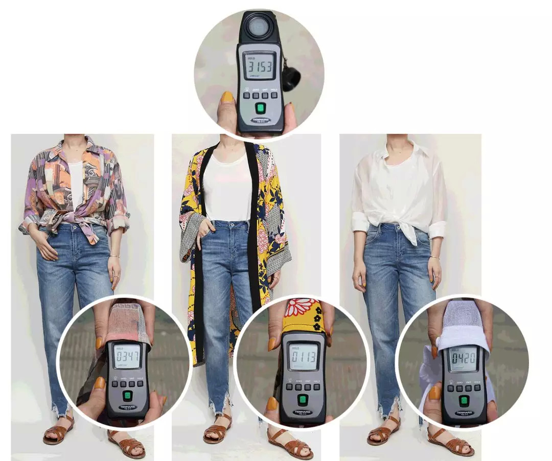 当日上海的紫外线达到3153μW/cm2,我们分别测试了一件衬衫、一件kimono和一件薄纱外套。发现面料最稀疏的薄纱外套防晒效果最差,穿上后有420μW/cm2的紫外线渗透;而面料最紧致的kimono相对防晒效果最好,紫外线只渗透113μW/cm2。