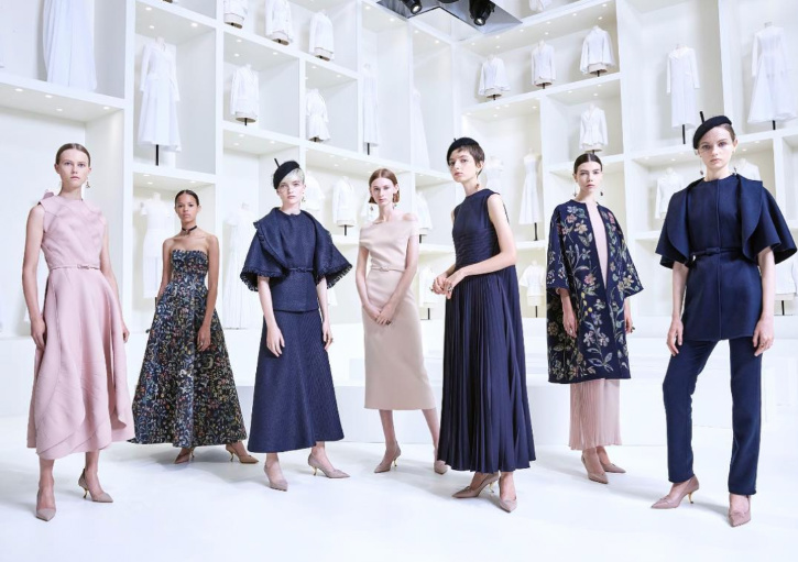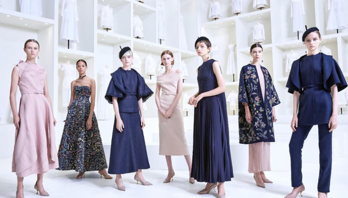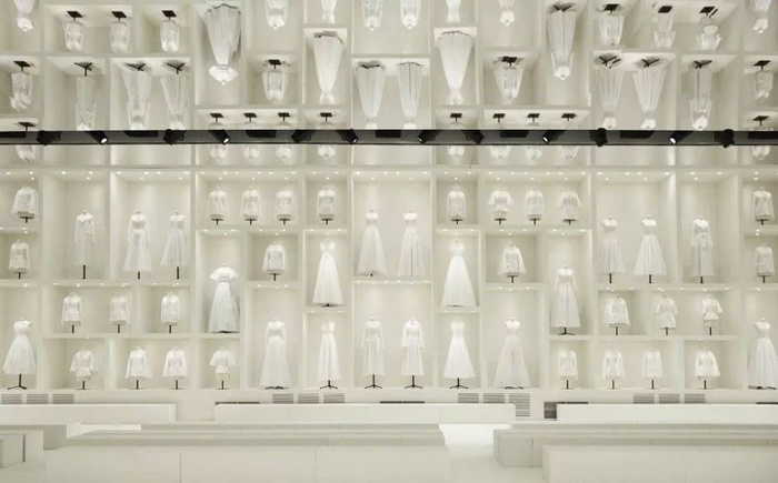 Christian Dior2018秋冬高定系列在巴黎著名的罗丹美术馆(Musée Rodin)发布,会场布置走极简风格,大量白色的衣胚静置于墙面,头顶则是白炽灯和镜面,大空间的镜面对称效果有种科幻感。