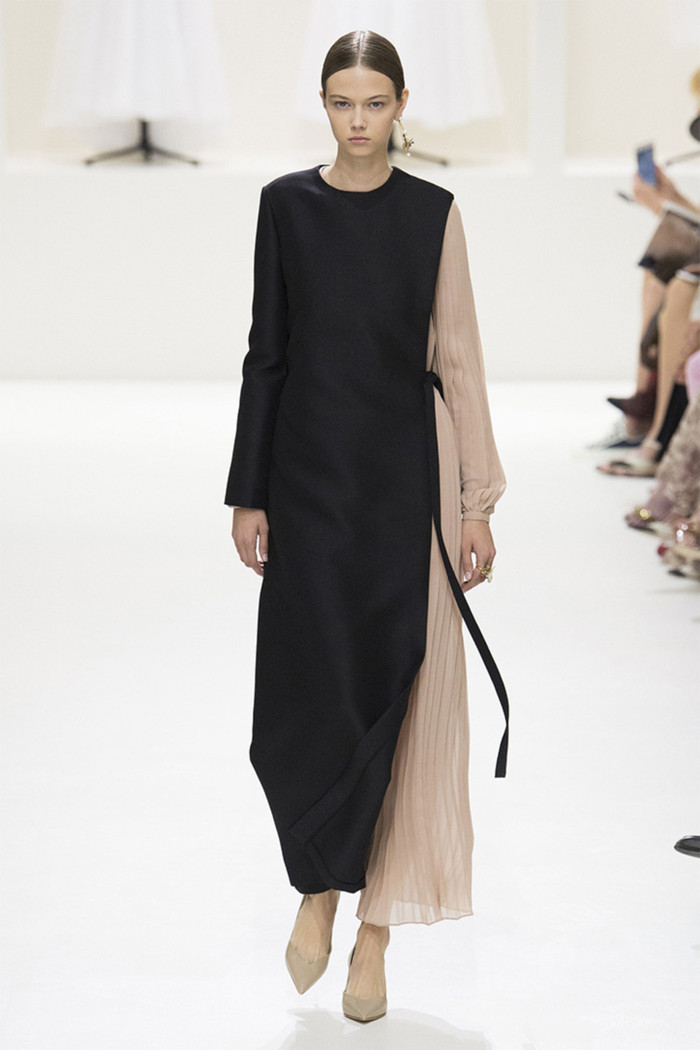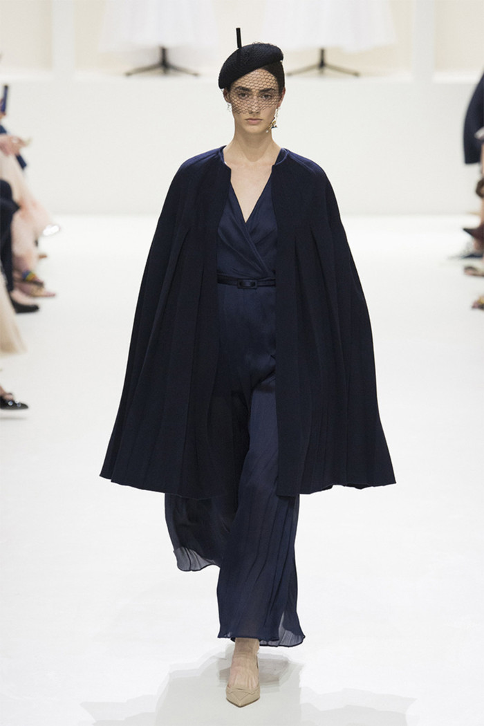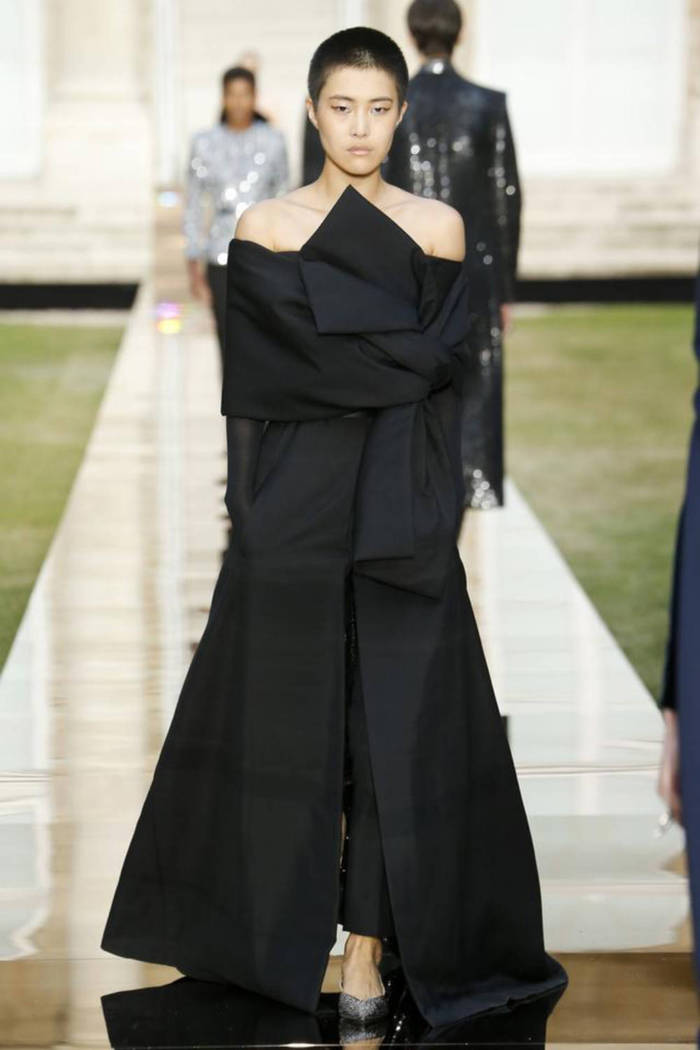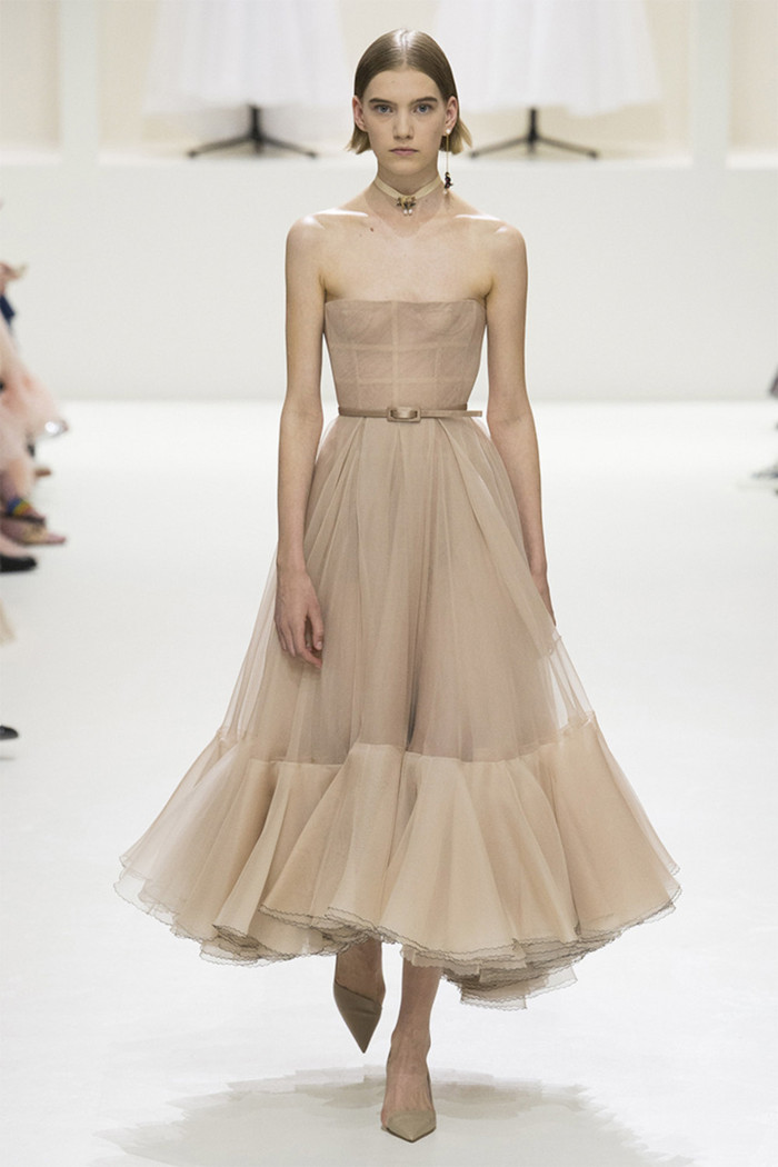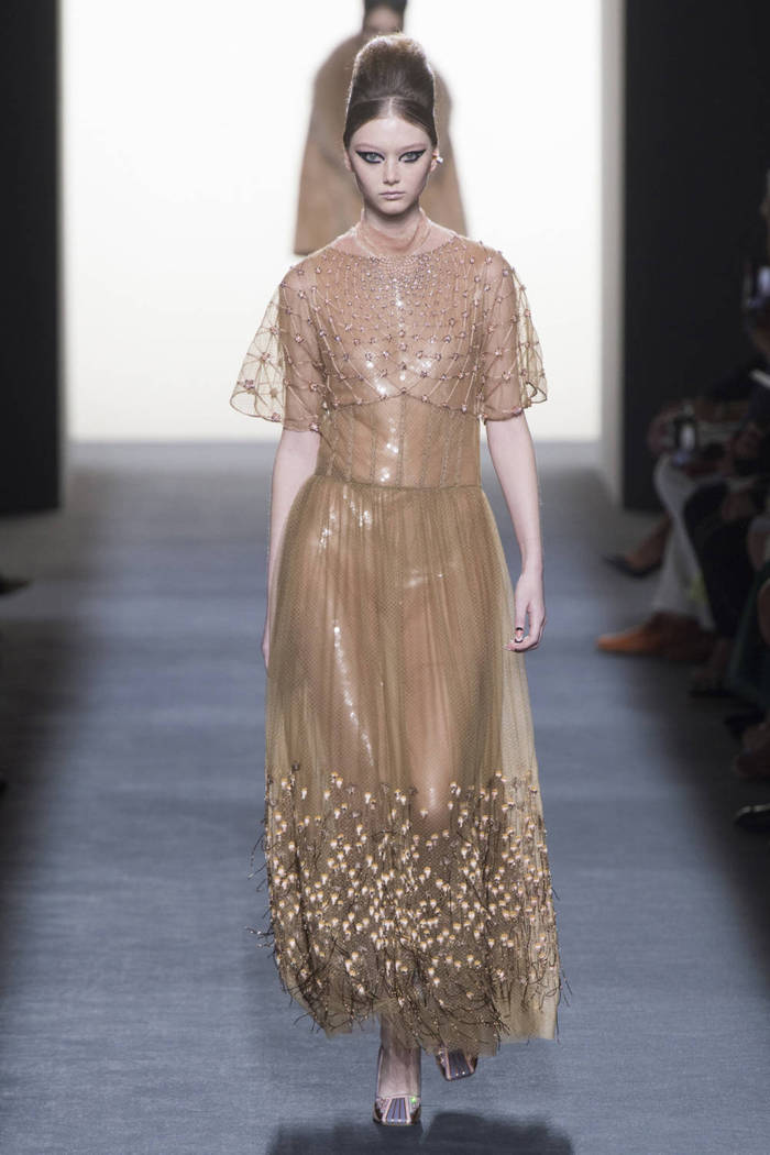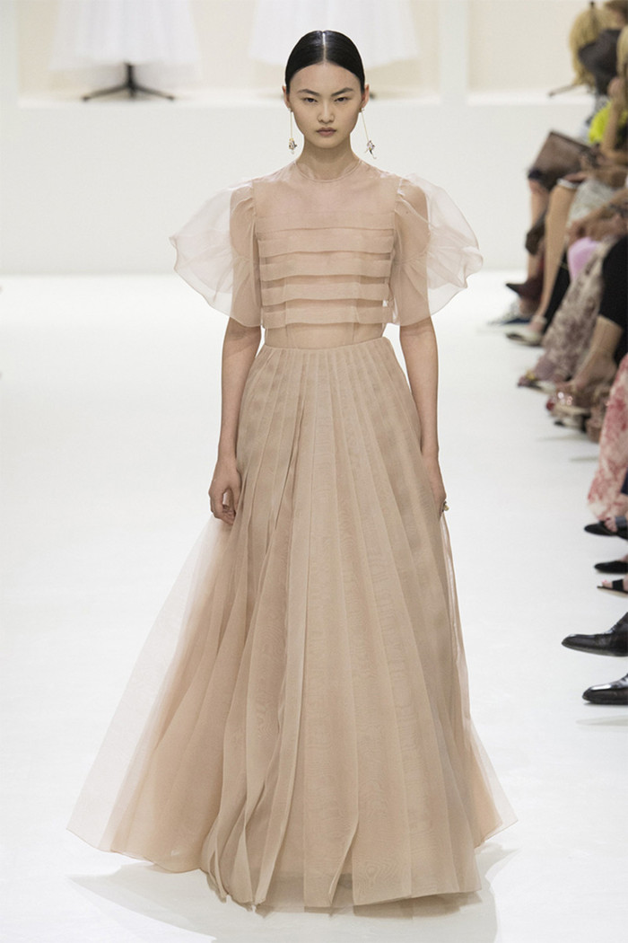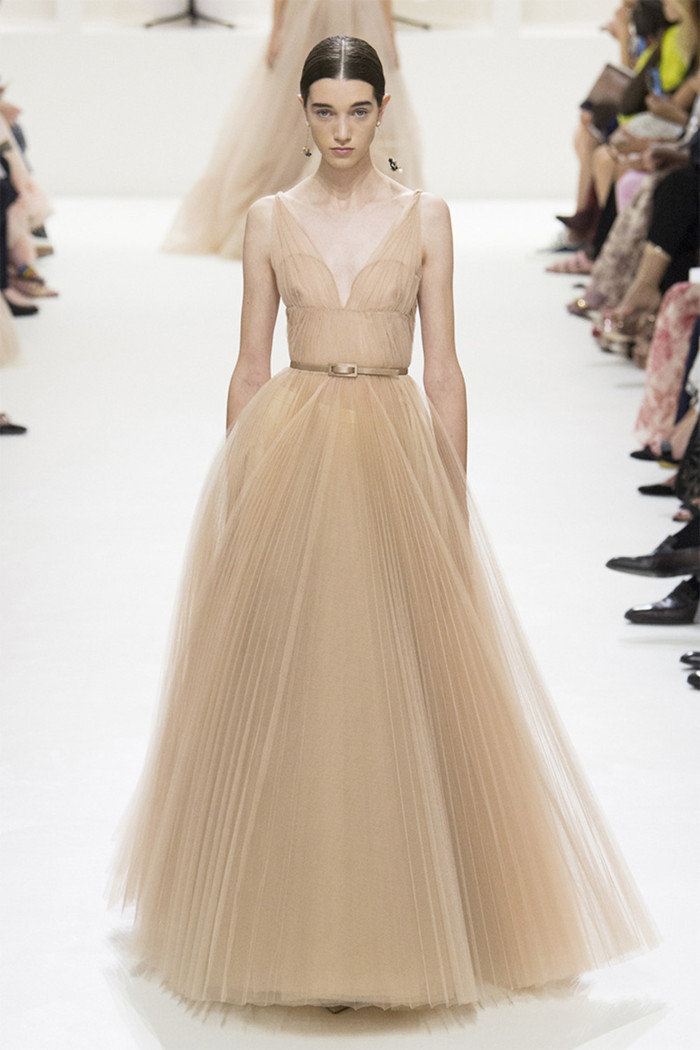 Maria Grazia Chiuri打破常规的高定传统,经典的Bar Jacket多了一对蝙蝠般的羽翼,大面积的精致刺绣附于薄纱之上,金色的西服套装线条利落。裸色是本季的主打色,低调优雅,不同种类的褶纹重叠,走动时划出自然流畅的波纹,仙气十足。