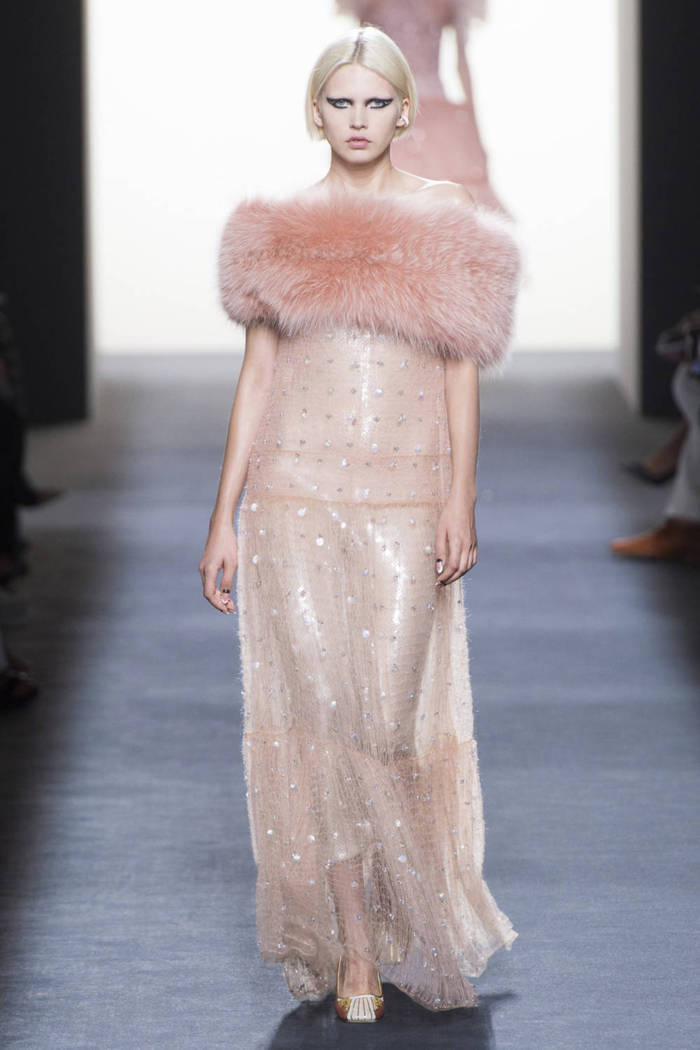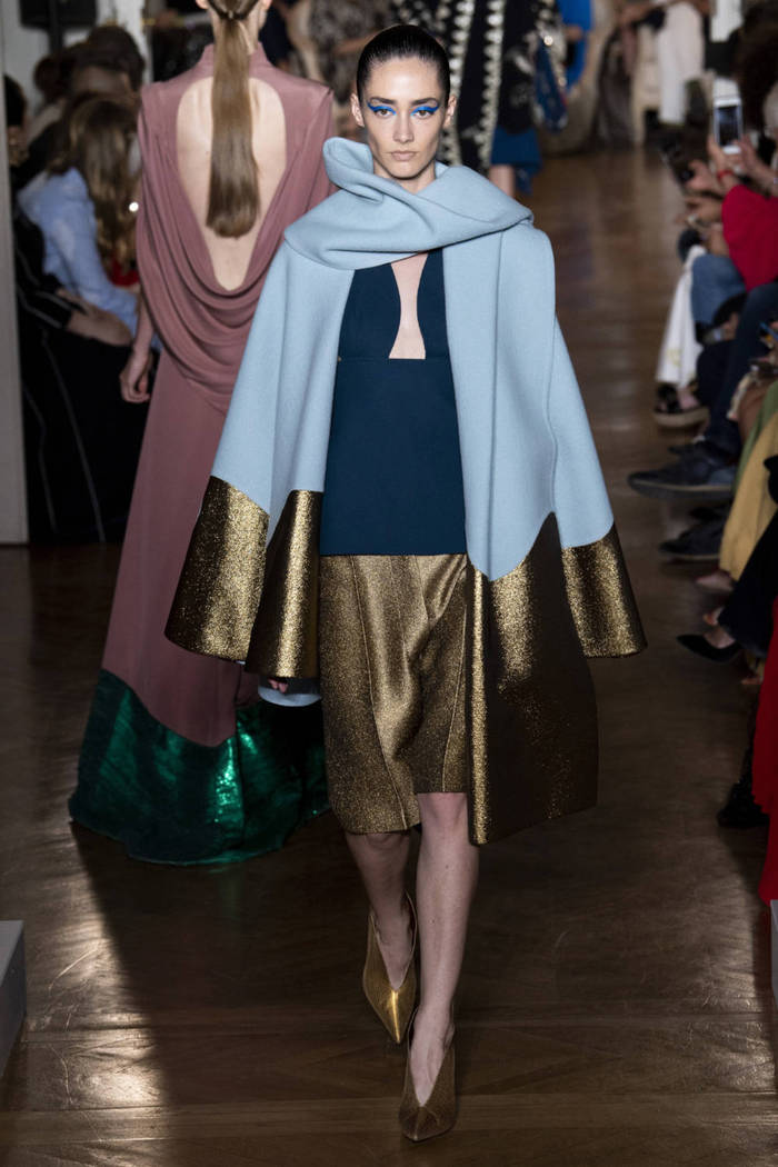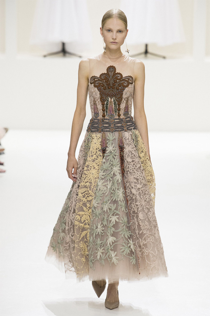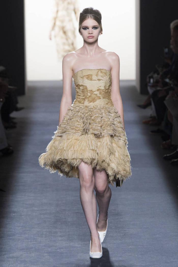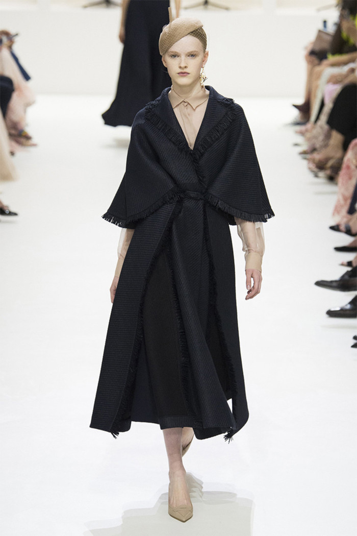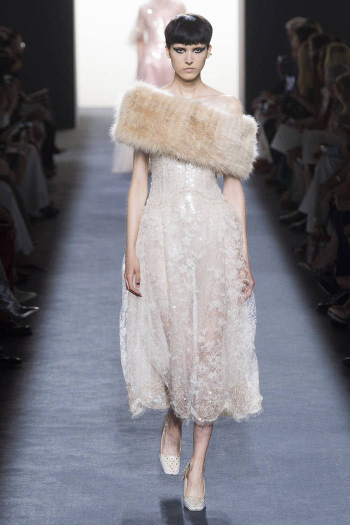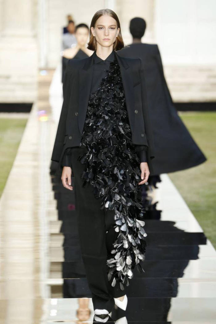 Maria Grazia Chiuri打破常规的高定传统,经典的Bar Jacket多了一对蝙蝠般的羽翼,大面积的精致刺绣附于薄纱之上,金色的西服套装线条利落。裸色是本季的主打色,低调优雅,不同种类的褶纹重叠,走动时划出自然流畅的波纹,仙气十足。