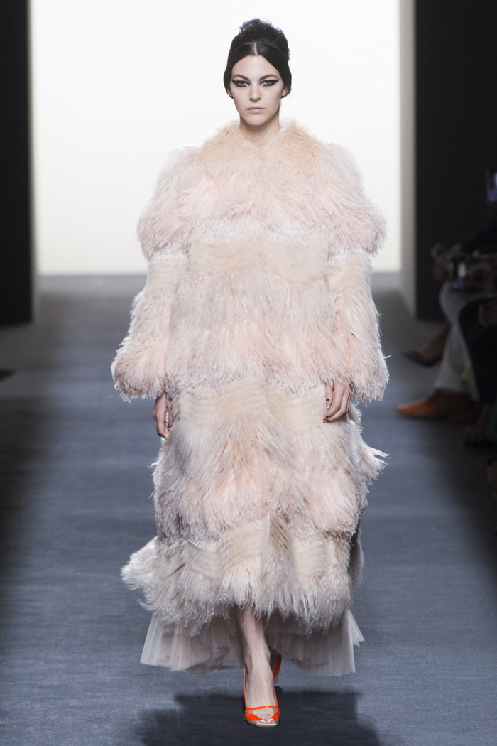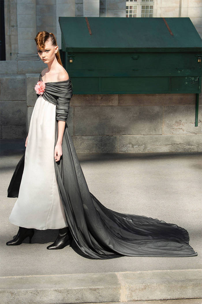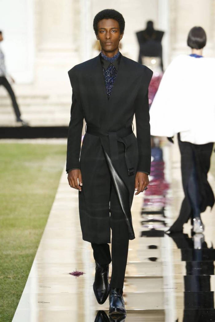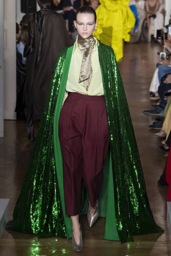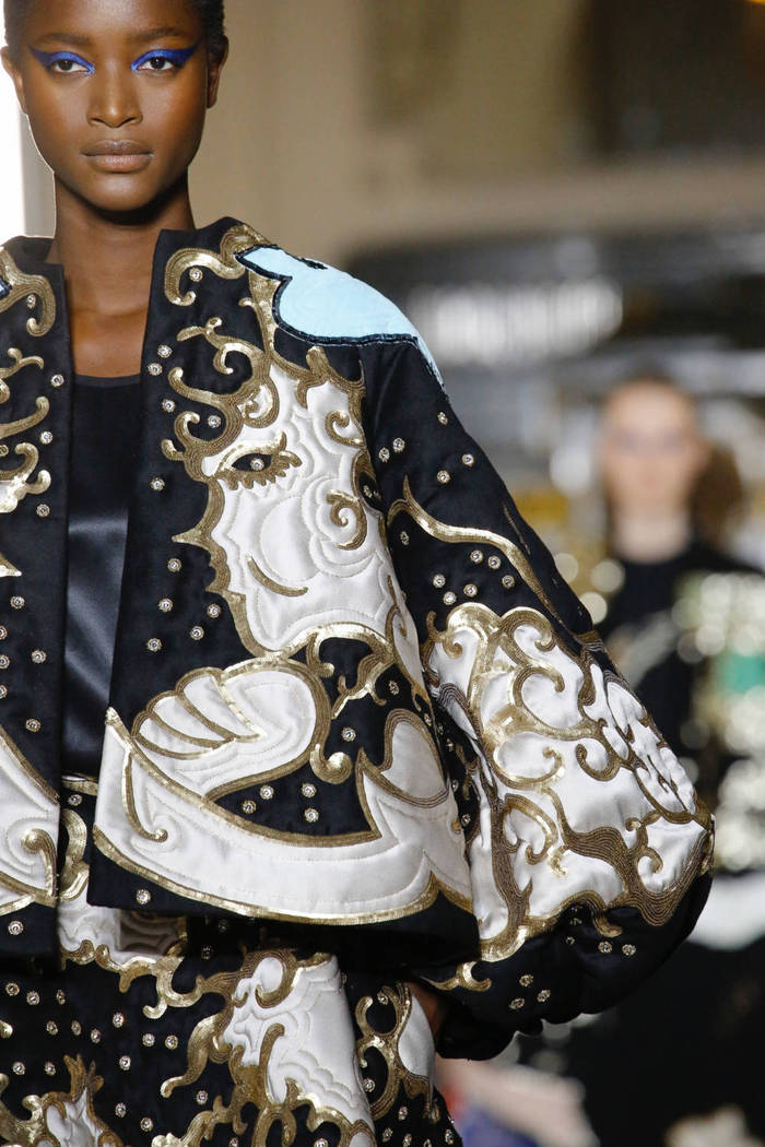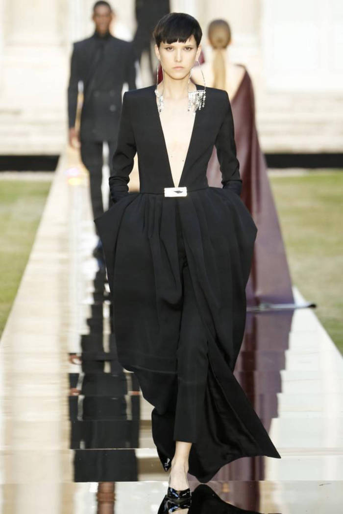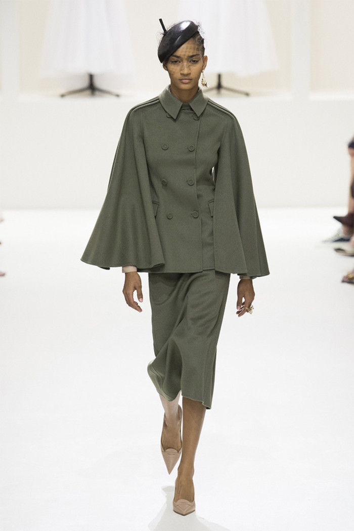 Maria Grazia Chiuri打破常规的高定传统,经典的Bar Jacket多了一对蝙蝠般的羽翼,大面积的精致刺绣附于薄纱之上,金色的西服套装线条利落。裸色是本季的主打色,低调优雅,不同种类的褶纹重叠,走动时划出自然流畅的波纹,仙气十足。