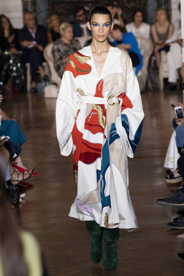 Valentino 2018秋冬高定系列以古希腊太阳神阿波罗为灵感,由创意总监Pierpaolo Piccioli创造了随意率性又不失端庄的一系列造型。Piccioli对欧洲古典艺术理解深刻,这一系列通过大量羽毛流苏和悬垂感营造出轻盈神圣的气质,款式包括古希腊神话中的战袍、宫廷风的礼服、斗篷和鞋靴等。大面积的刺绣和色块都被轻松驾驭,绸缎面料轻薄光滑,象征光明、高贵和辉煌的金色则贯穿始终。