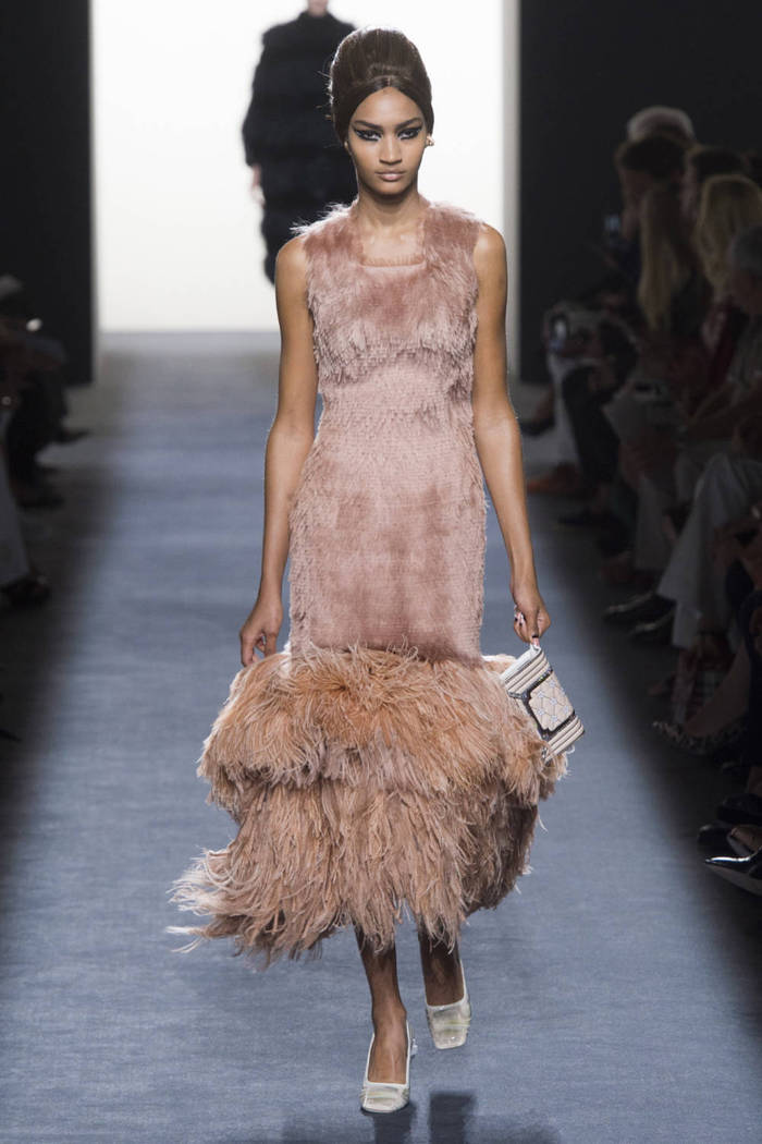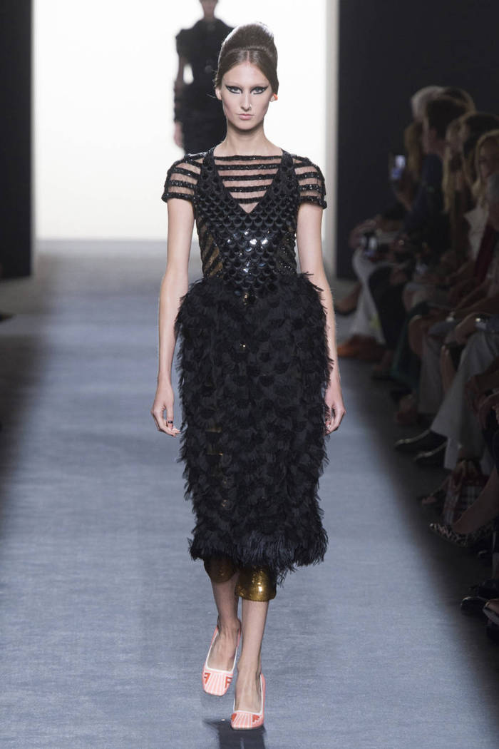 Fendi 2018秋冬高定系列用拼色的皮草系列开场,搭配涂鸦艺术,融合流苏、绳结和皮草等元素,野性与野性相碰撞。美人鱼系列异常引人注目,具有光泽感的材质让裙摆随着光线而变换,模特们仿佛行走在陆地上的美人鱼。包包也是系列亮点之一,抽象的印花铺满方形手拿包,渐变色块中和了金属材质的冷硬感。
