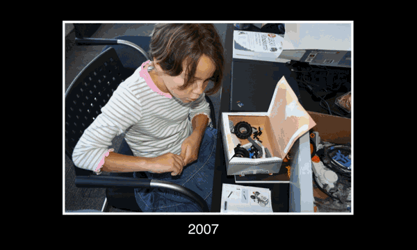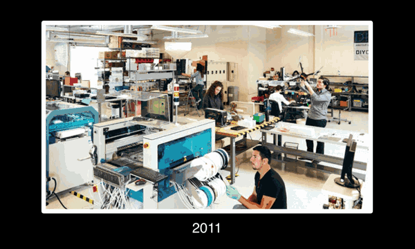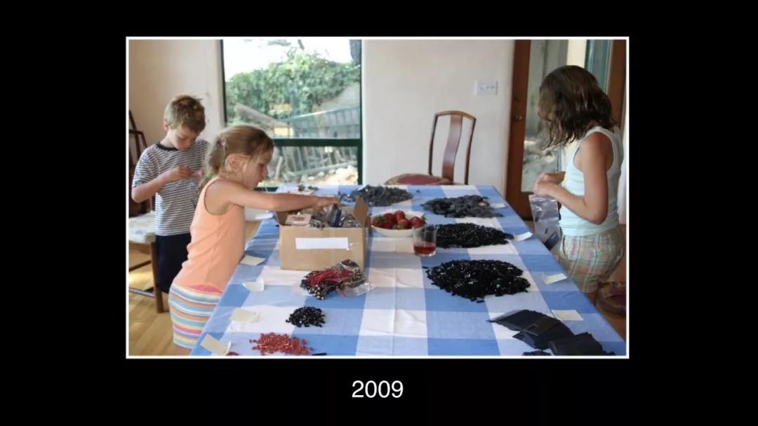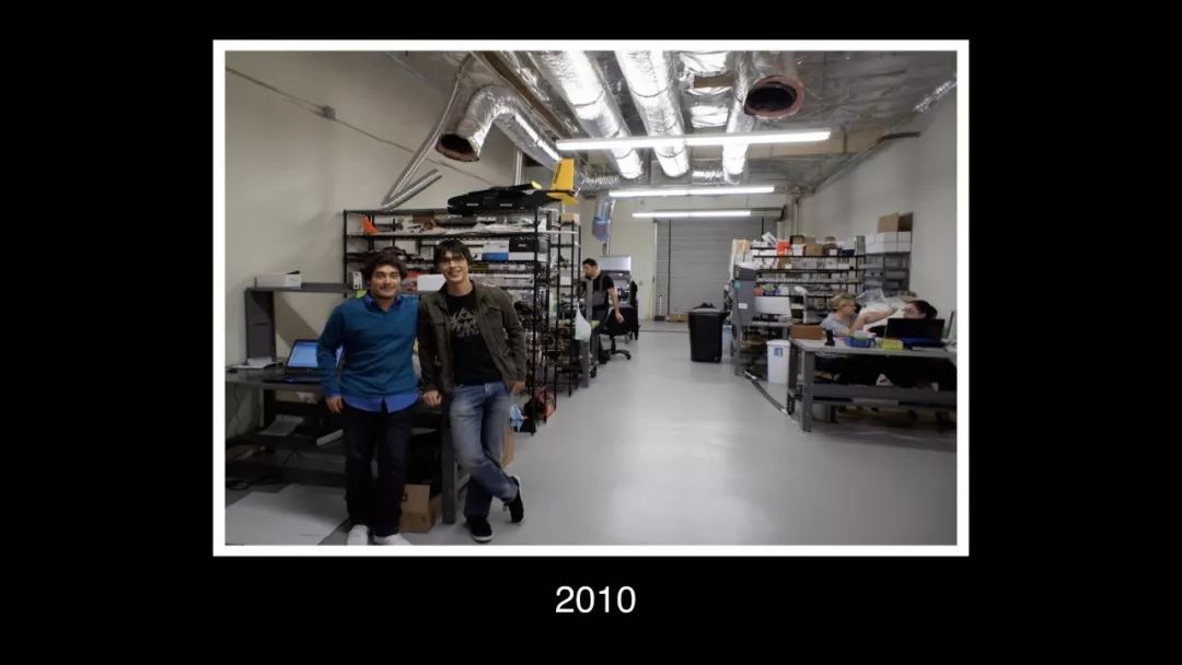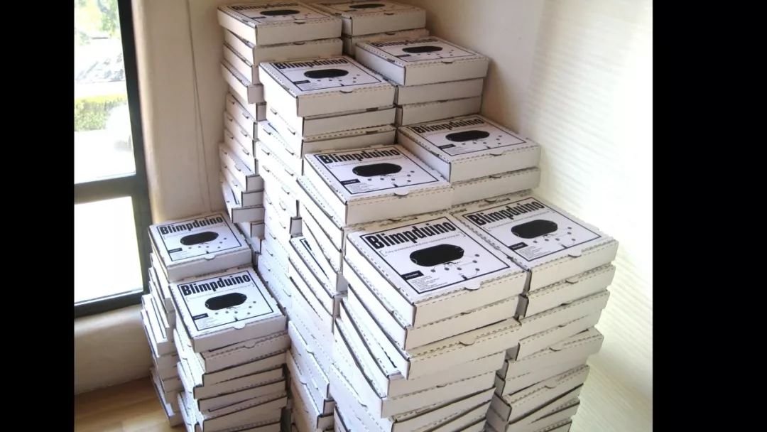 这就是我们的第一个公司。它看起来不像个公司对吧?其实就是我的孩子们在餐桌上把玩具部件组装成一个机器人小飞艇,然后装进比萨包装盒里,拿到科技展会上摆摊卖掉。