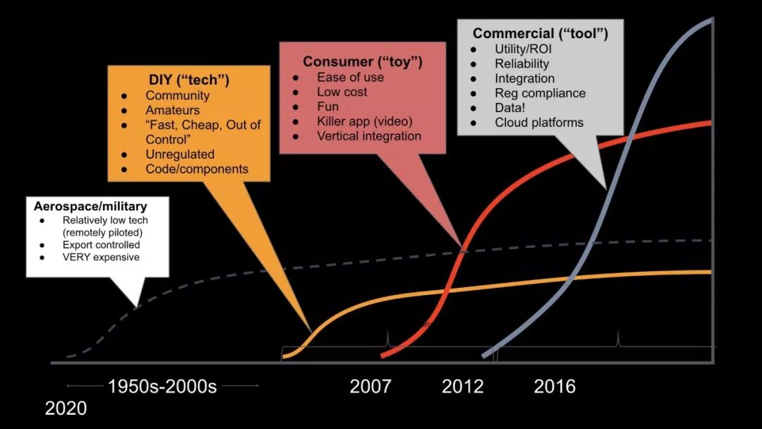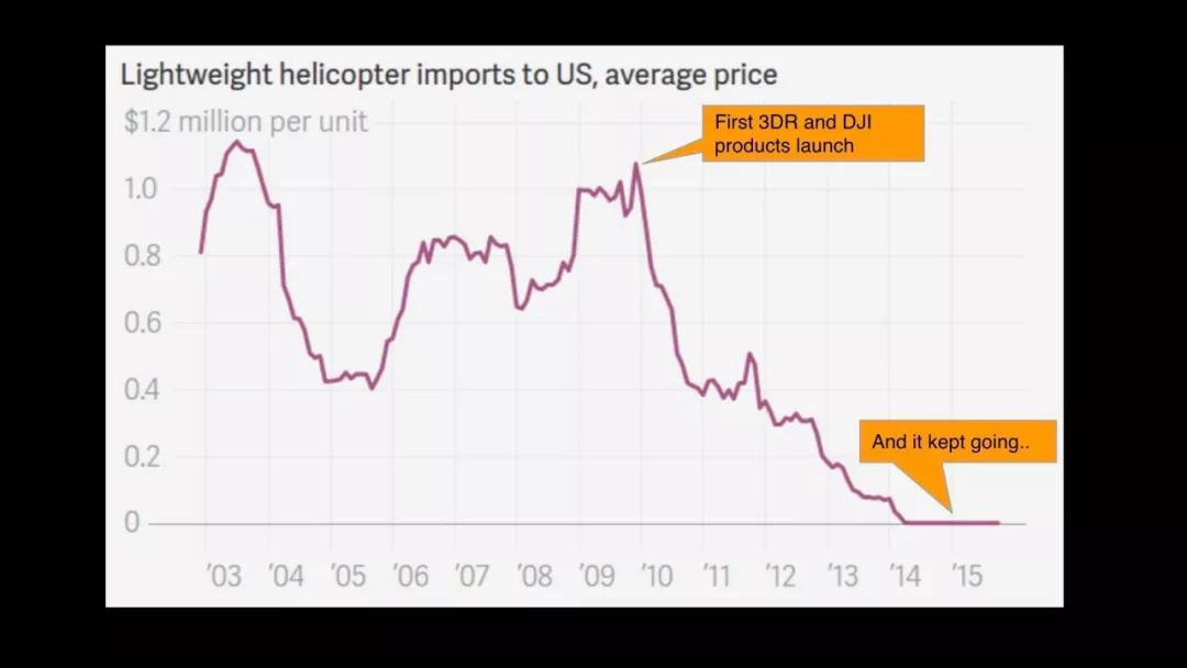 正如我开头所说的,中国是世界上最具颠覆性的国家,在我们毁灭了直升机行业后的九个月内,无人机价格又下降了70%,我们被大疆颠覆了。