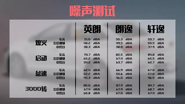 至于NVH方面,我们则是利用分贝仪分别测试发动机启动、怠速以及3000转的三种工况下,三款车的车内外噪音数据,从我们测出的数据可以看到,搭载三缸发动机的新款英朗在发动机的抖动控制和NVH方面丝毫不输朗逸和轩逸。