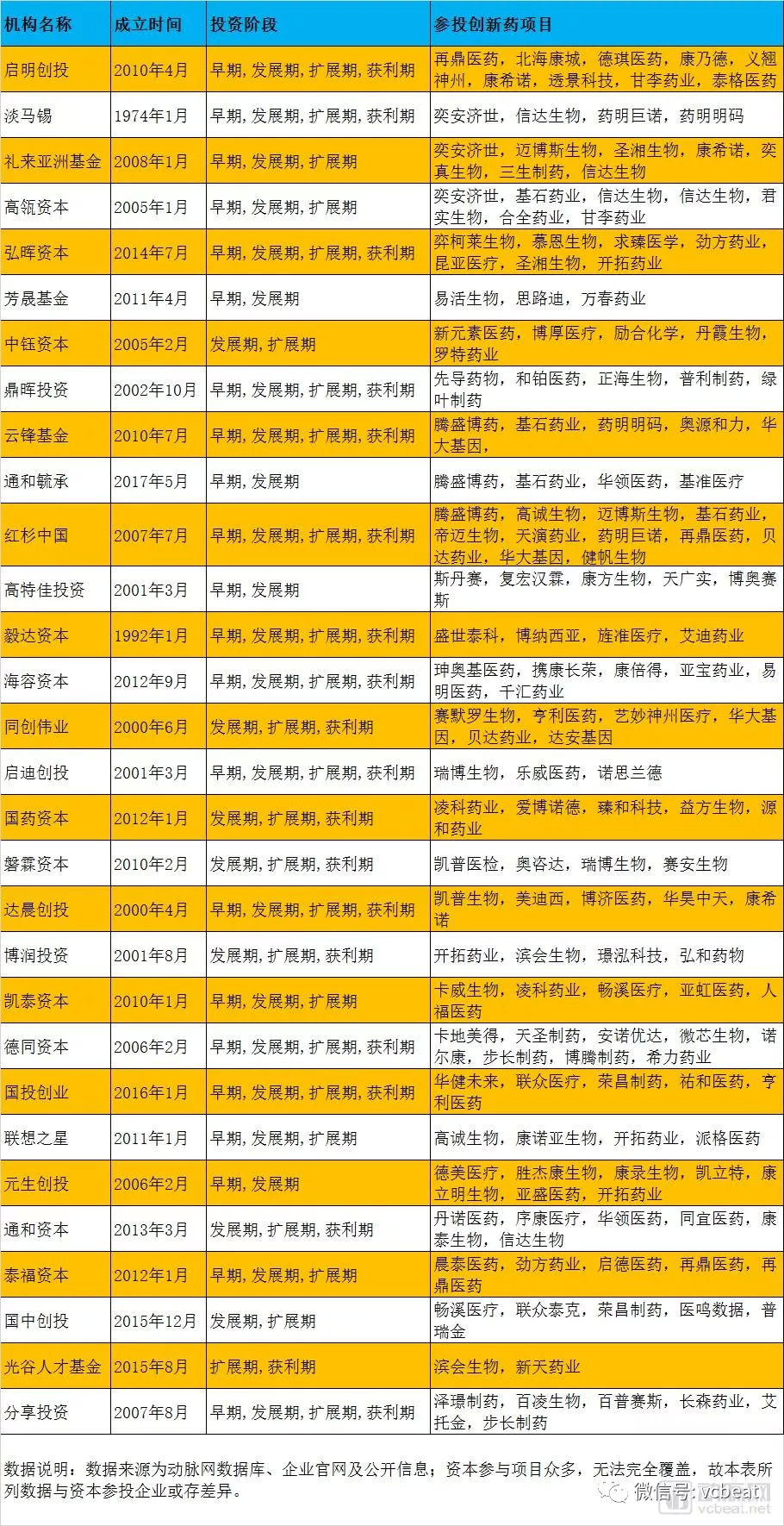 从资本背景看,大致分为两类——老牌的机构投资者以及有医药背景的产业资本,前者以红杉、淡马锡为代表,后者以通和资本、高特佳等为代表。
