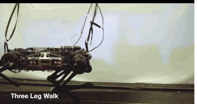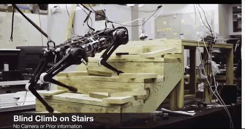 “我们想先做一个不需视觉的很好的控制器,”Kim说,“当我们为它增加视觉能力,即使可能反馈的是错误的信息,腿也应该能够处理(障碍)。因为如果它踩到了摄像机看不到的东西怎么办?它要怎样行动?这就是盲眼运动的作用。我们不想太过相信自己的视觉。”