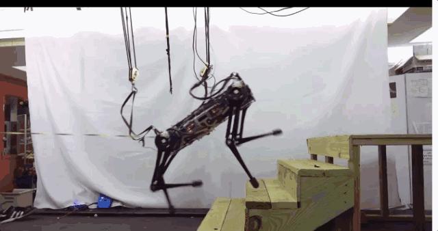 “它不知道每个台阶的高度,也不知道楼梯上有障碍物,但它只是尽力在不失去平衡的情况下艰难前行,”Kim说,“如果没有这个算法,机器人非常不稳定,很容易摔下来。”