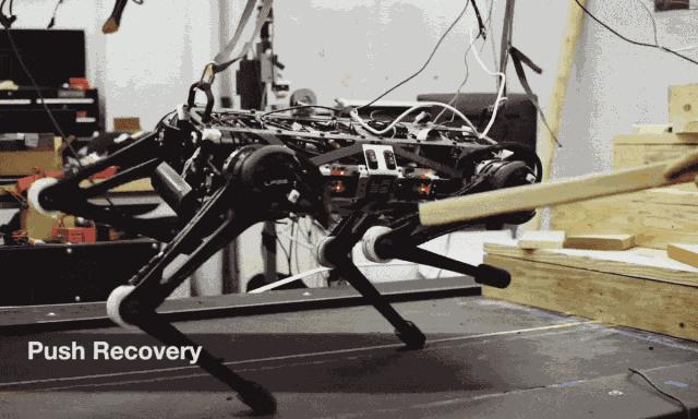 该算法被设计成每50毫秒对每条腿进行一次计算(或每秒计算20次)。在实验中,研究人员在机器人在跑步机上小跑时用脚踢和用力拉扯,并在它爬上满是障碍物的楼梯时用皮带猛拽。他们发现,模型预测算法使机器人能够快速产生反作用力,以恢复平衡并继续前进,而不会朝相反的方向摔倒。