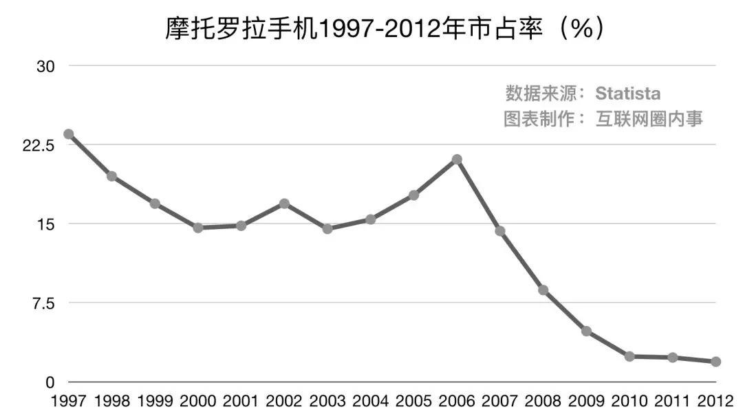 如果说诺基亚是在 2011 年前后,在智能手机的浪潮之下突然崩塌,那么摩托罗拉则是在这个浪潮到来之前,便已经逐渐衰落至谷底。1998 年失去霸主地位之后的摩托罗拉,在之后的十几年间成绩不甚理想,市占率持续走低。而 2006 年前后依靠一代神机 V3 所创造的销量逆袭,如今看来也不过是回光返照。十几年间,摩托罗拉变成了一家顶着名牌光环、大而不倒的老牌厂商。