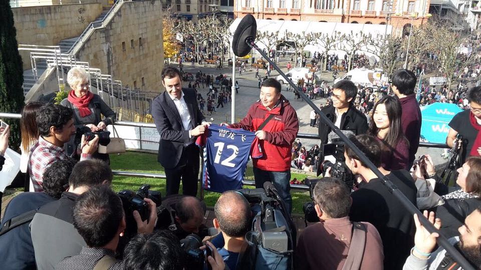 西班牙国家电视台和皇马队报《马卡报》记者都扛着摄像机来了。“I come from China.”曹龙飞对《马卡报》记者说。随后,他立刻穿起球衣,在大街上逢人就喊“AUPA EIBAR”(加油,埃瓦尔)。