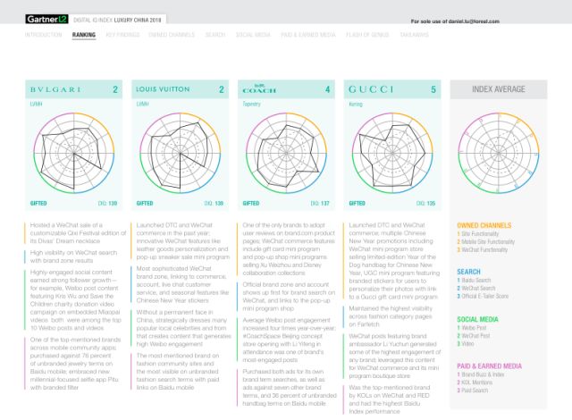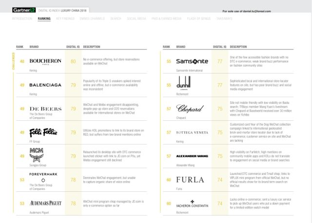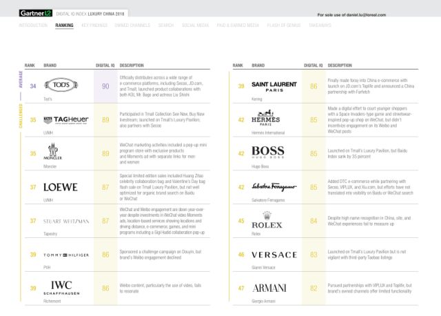 随着中国奢侈品市场恢复到两位数的增长,预计到2024年,中国消费者将占到所有奢侈品消费的40%,品牌能否成功取决于能否找到与这个至关重要的消费群体产生共鸣的数字化战略。这一增长推动了大型电子商务的推出和实验,包括微信小程序、品牌官网,第三方电商平台等。这是Gartner L2 Digital IQ Index(数字营销智商)最新发布(2018年7月)的全球奢侈品牌Digital IQ Index榜单及报告。