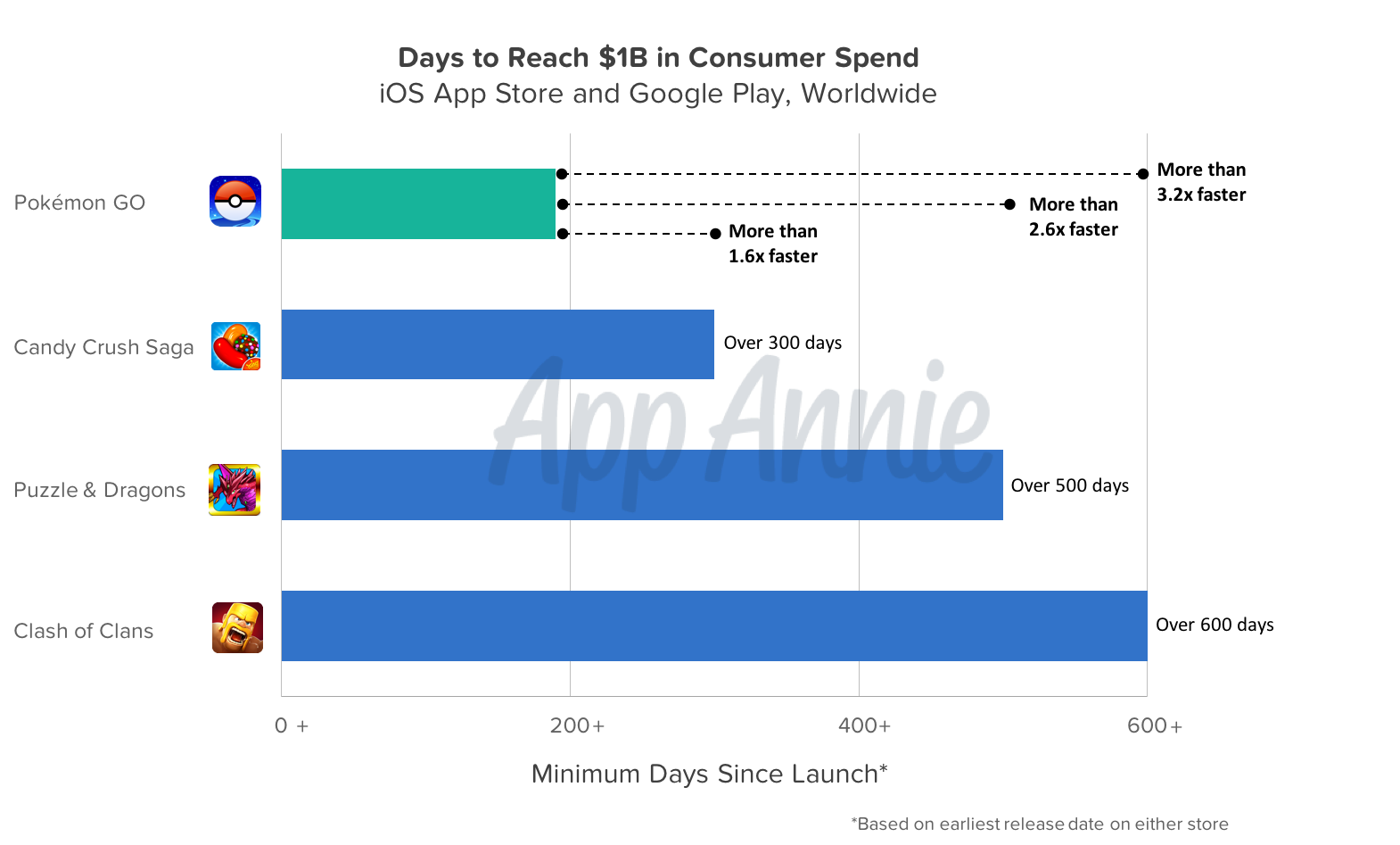 得益于游戏初期超高人气,Pokémon GO也成为历史上最快达到10亿美元收入大关的手游,App Annie指出,在游戏上线第一年,Pokémon GO的收入就达到12.5亿美元。而它突破10亿美元收入的速度也是《皇室战争》的3倍多。
