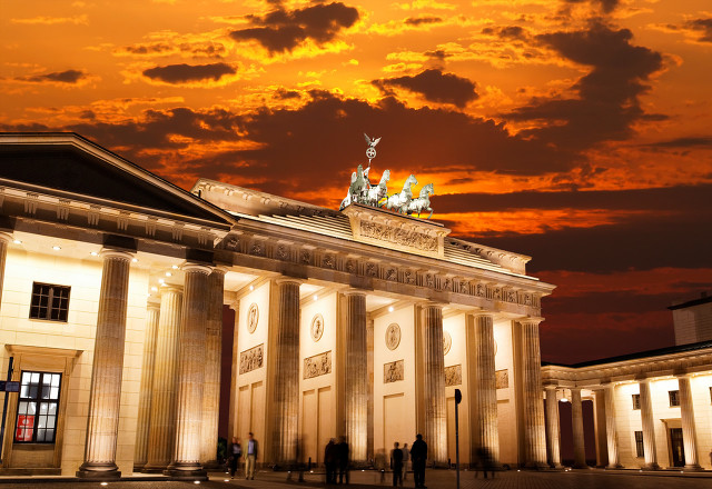 位于德国首都柏林的市中心,最初是柏林城墙的一道城门,因通往勃莱登堡而得名。这是一座新古典主义风格的砂岩建筑,仿照了希腊雅典卫城的柱廊建筑风格。而其亮点在于门顶中央最高处的一尊胜利女神铜制雕塑,女神右手手持带有橡树花环的权杖,花环内有一枚铁十字勋章,花环上站着一只展翅的鹰鹫,鹰鹫戴着普鲁士的皇冠。雕塑象征着战争胜利。如果说勃莱登堡门是柏林的标志,而这个雕塑便是该门的象征。