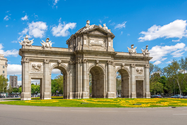 阿尔卡拉门是马德里仅存的几个古老城门之一,建于1788年,矗立在市中心的独立广场,位于通向阿尔卡拉的大道的起点,旁边就是丽池公园。大门为新古典主义风格,采用大型罗马凯旋门的形式,有5个门洞,其中3个是半圆拱门,另2个为平拱门,是18世纪欧洲史无前例的建筑巨作。而阿尔卡拉门周围就是当地有名的酒吧聚集地,看完夜景再去酒吧感受下皇家马德里的氛围想必也是难忘的经历。