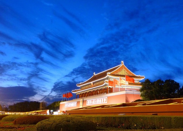 天安门位于北京城的传统的中轴线上,由城台和城楼两部分组成,造型威严庄重,气势宏大。而天安门前广场最吸引人就是恒久不变的升旗仪式了,每天清晨5点至7点,根据一年中不同的日出时间而开始,千万人聚集在广场随着国歌的节奏看国旗俨然升起,这种自豪感不论多久都不会过时。