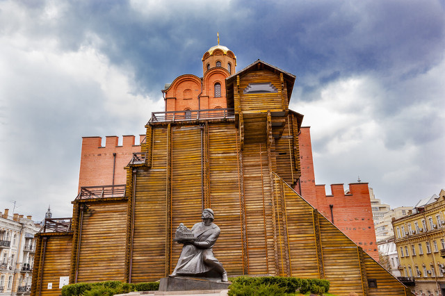 建于11世纪,是现存不多、保留完好的雅罗斯拉夫大公时代的建筑之一。金门是古代基辅城的正门,门扇和门楼上的教堂圆顶装饰有镀金的铜箔,因此而得名。修建金门在当时有两个作用,一是作为当时基辅最要主要的城门,二是作为防御之用。1983年金门遗址经整修后辟为博物馆,对游人开放,馆内陈列许多古基辅的文物。而在金门的后面是一个喷泉,规模虽不大,但透出一种古典之美。