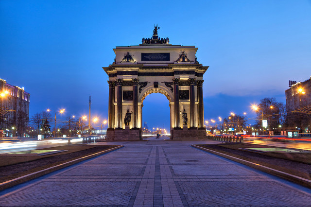 莫斯科的凯旋门是为纪念 1812 年俄军击溃入侵法军而建的,高达 28 米。莫斯科凯旋门和巴黎凯旋门造型相似,只是形体略小。让人诧异的是,这两座凯旋门都是为了纪念同一场战争而建,两者虽风格各异,却同是艺术珍品。莫斯科凯旋门的下方分列着四尊身着古时盔甲执枪持盾表情严肃的俄军士兵雕塑,其手指上刻有 “ 驱逐法兰西,解放莫斯科 ” 的字样,整座建筑气势雄伟,古典大方。