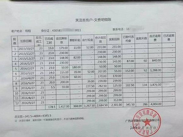 网络流传的一份名为“程翔”的客户欠费明细账单显示,他出生于1998年,于2015年10月27日开始兼职还款,共分12期,每期需还23工时或299元。该账单显示,2016年1月27日,程翔有87元本金未还,逾期60天,应还逾期费840元。同年3月,他欠款152元未还,逾期92天,逾期费达1288元。同年6月,他欠款102.50元未还,逾期134天,逾期费为1876元。截至2016年9月27日,账单显示,翔欠款341.5元,逾期286天,逾期费竟高达4004元,总欠款变成4345.5元。