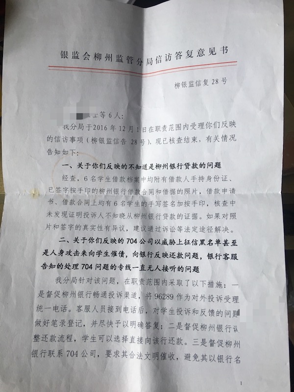 2017年1月23日,银监会柳州监管分局答复称,经查,6名学生借款档案中均附有借款人手持身份证、已签字按手印的柳州银行借款合同和借据的照片,借款申请书、借款合同上均有6名学生的手写签名加按手印,核查中未发现证明投诉人不知晓从柳州银行贷款的证据。