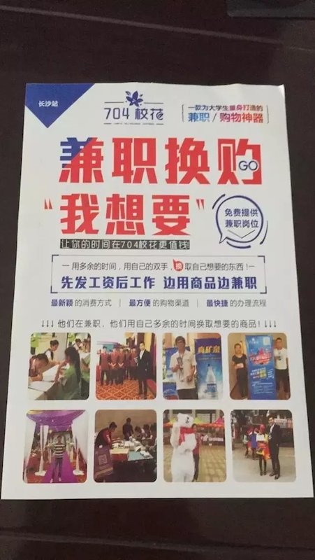 2015年,广西某高校大一学生蓝敏(化名)想寻找勤工俭学的机会。他注意到,校园里出现了一个以兼职换购商品或现金的活动,名为“704校花”,吸引了大量学生关注。“因为我当时缺钱,而且舍友也都去换购了,所以我也心动去换购了2000元的现金。”他回忆。
