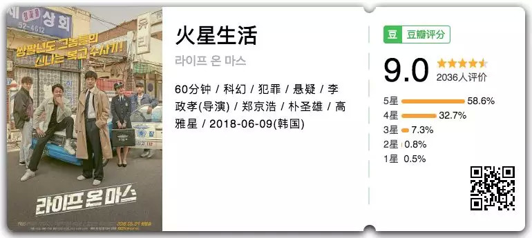与前者一致的是,这次以复古巡查队为主角的[火星生活],从演员造型、场景设计都相当到位,让人仿佛置身于80年代。编导更动了不适合韩国现实的情节,走韩式笑点,也保住原版要传达的精神,导演运镜利落、剪辑流畅。