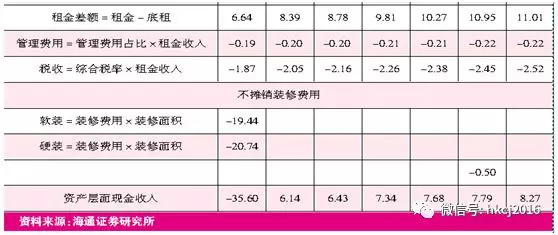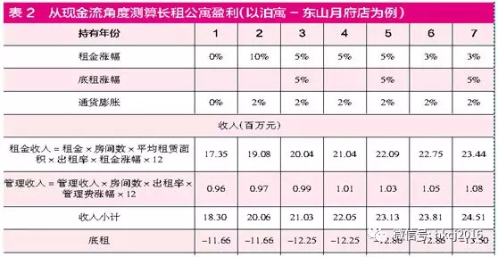 海通证券曾经以广州万科泊寓-东山月府店为例,从现金流的角度大致测算了一个集中式长租公寓的盈利情况。由于装修是前期一次性支付,所以现金流上东山月府前期软装硬装花费约4000万元在第1年时全部扣减,再假设前5年家具等较新,无需维修,从第6年往后每5年支出50万元维修费用,相当于每月每平米3元。日后现金流入的增加主要因为租金增速高于底租租金增速,由此算得项目保守估计大约7年回本。(见表1、表2)