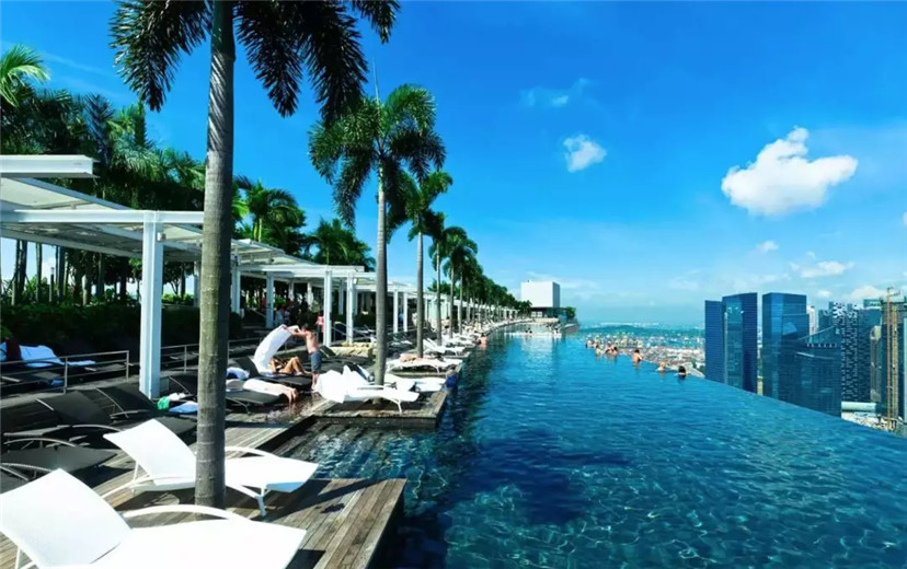 金沙酒店的游泳池坐落在这座 57 层高的建筑顶层,是目前全世界最长的户外游泳池之一。而且,这个泳池本身就是一个观赏新加坡天际线的绝佳观景台。