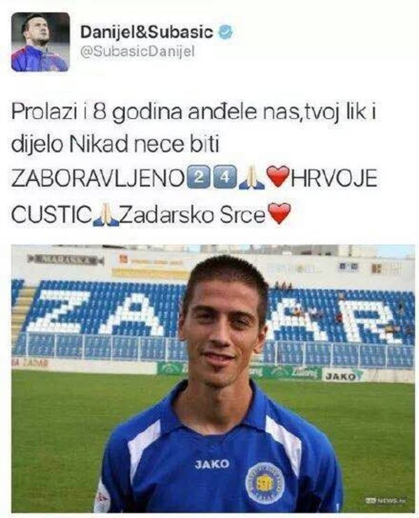 原来,球衣上的男子名叫赫尔沃耶·库斯蒂奇(Hrvoje Custic),是苏巴西奇的挚友。俩人曾经同在扎达尔俱乐部效力。