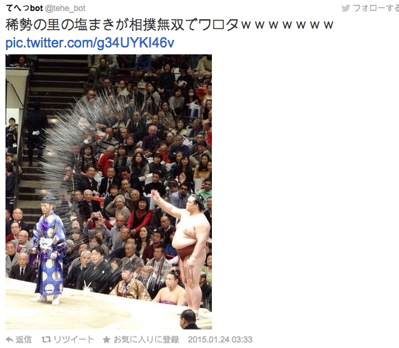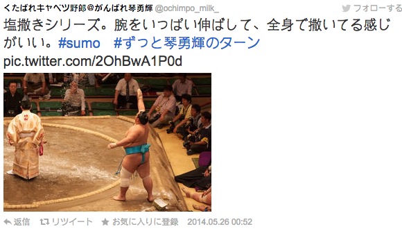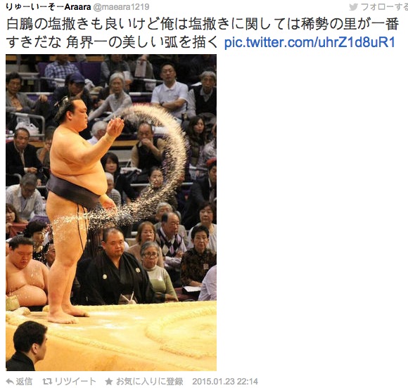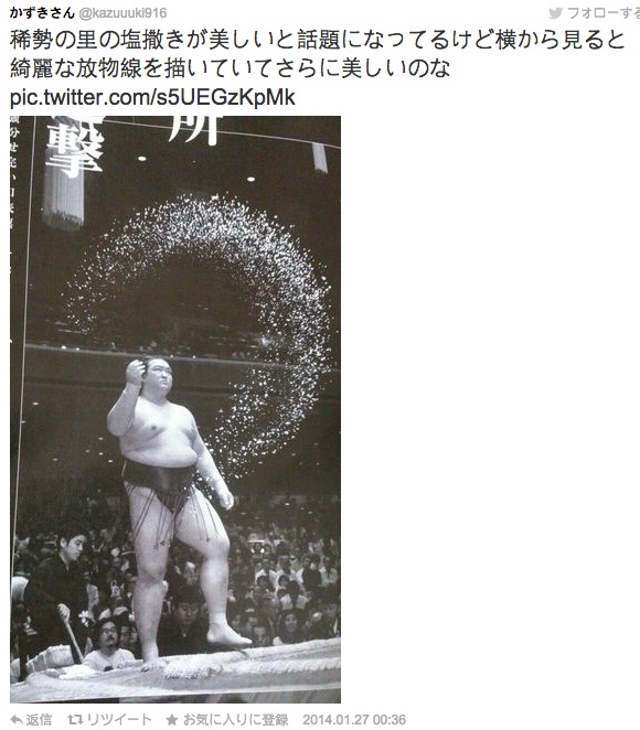 “稀势之里撒盐之美受热议,从侧面看的话,好像一道漂亮的抛物线,更美了。”