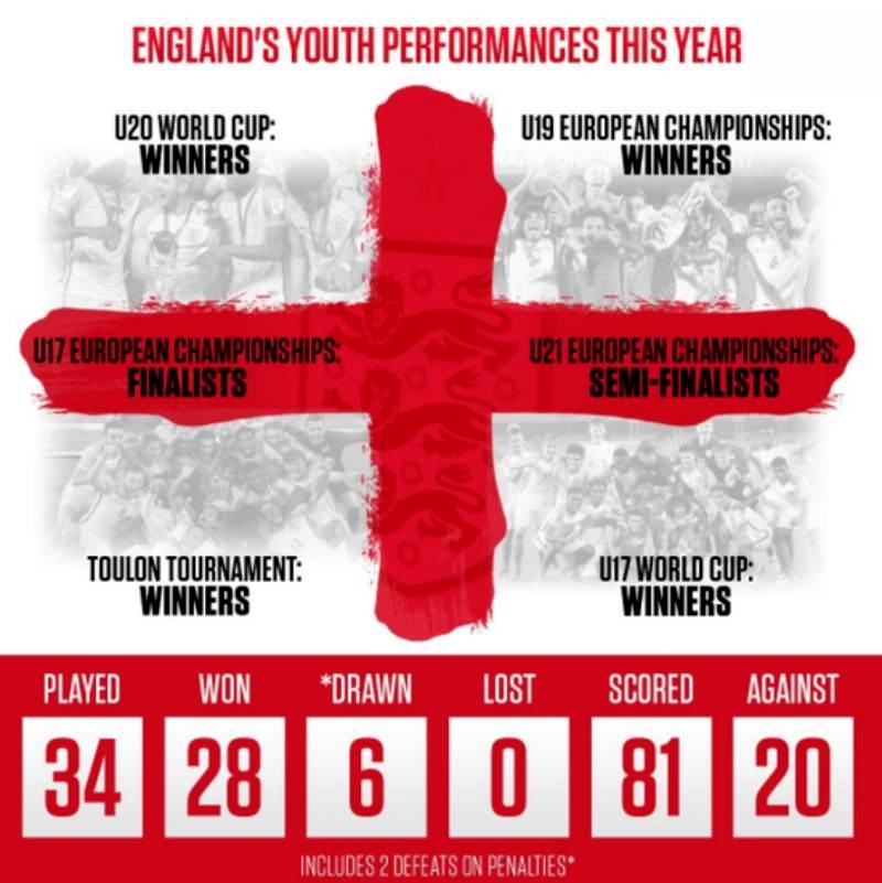 从EPPP计划在2012-13赛季开始实施,英格兰的青训终于在2017年开花结果。在全年的六项青年大赛,英格兰的“出笼幼师”们五进决赛,并斩获冠军“大四喜”: