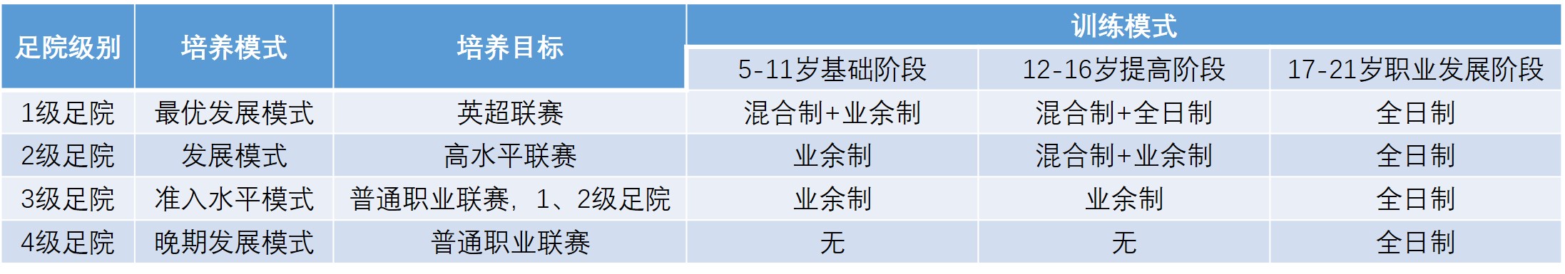 这项计划主要针对原有青训体系的组织构建、训练体系、竞赛体系、球员管理等方面进行改革和完善。比如,EPPP在原有2个级别的基础上将青训体系进一步细分为4个级别,同时将青训覆盖的年龄范围由以前的9-18岁扩展至5-21岁(具体细分为5-11岁基础阶段、12-16岁提高阶段、17-21岁职业发展阶段),由此形成“4级3段”的青训体系。