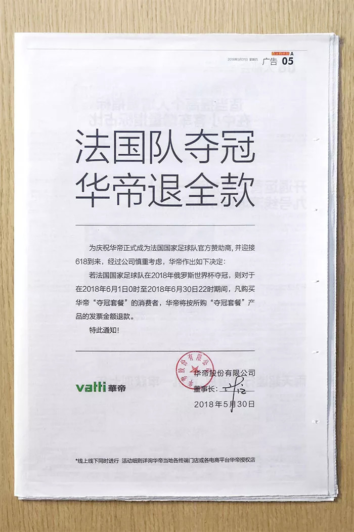 3、华帝董事长正式签字登报:法国队夺冠,华帝退全款!