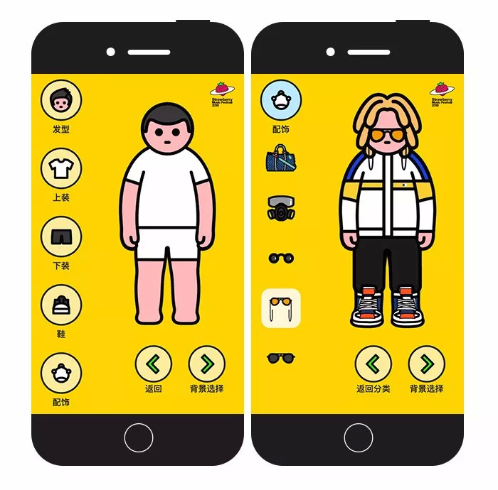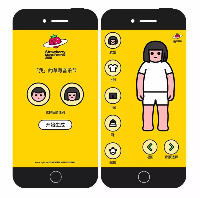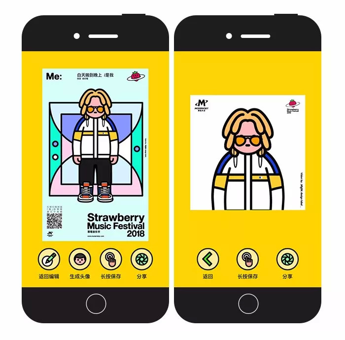 虽然个性化的定制很常见,但这个H5整体的视觉效果很时尚、明亮,而且简单的操作方式让玩家可以在1分钟之内生成一张属于自己的草莓音乐节海报,个性化十足,设计风格鲜明。难怪能够在朋友圈引起大量的转发和参与量。