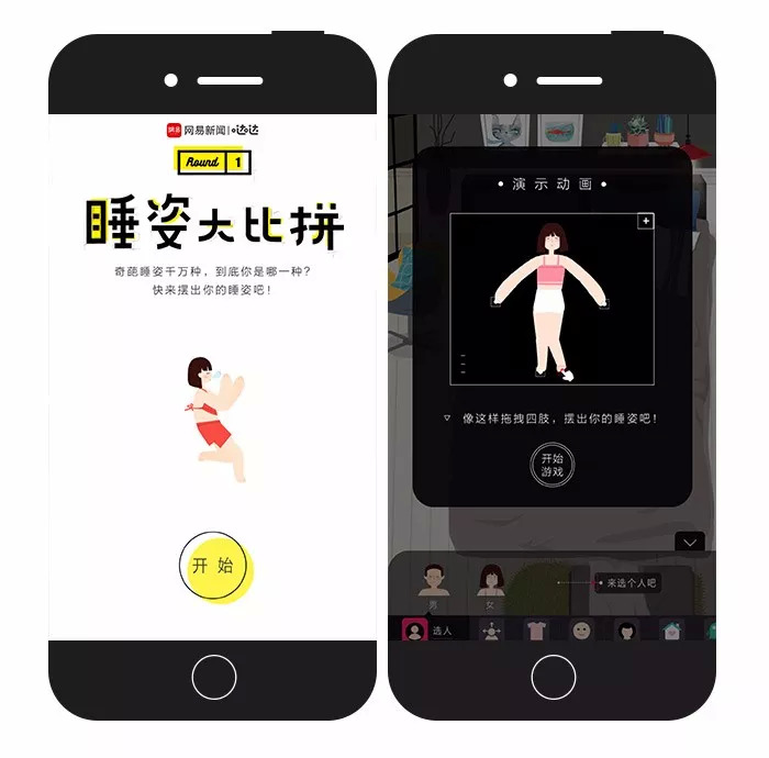 H5以睡觉为主题,设计风格非常小清新,从人物的打扮、发型、衣着、睡觉的脸型,到床的造型、床上用品,到家里的小宠物,一应俱全,色调和小物件符合年轻人的审美。简单的操作,引发大量网友传播,既满足了人们想要分享自己生活的欲望, 也满足了“窥探者”的好奇心,一举两得,转发自然也不在话下。不过后期网友越玩越High,画风也开始放飞模式。