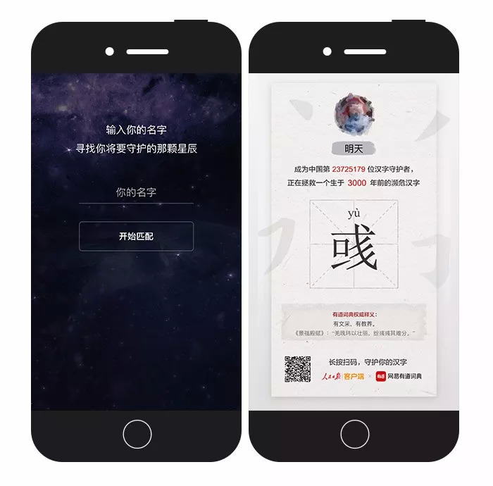 “以你之名,守护汉字”是由人民日报携手有道词典打造的一个H5,共同呼吁人们一起守护濒危汉字,守护我们国家伟大的传统文化遗产——文字。