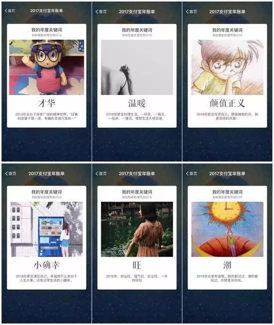 通过大数据抓取每个人的账单数据后,并一一展示,用户还可以选择保存图片,随后为每位用户智能预测 2018 年度关键字,如自由、小确幸、旺、快乐、坚持、范儿、颜值正义、温暖等带有“个人标签”性质的热词,让用户的好感度激增,刺激分享。据悉,年度关键词是根据每个用户的消费数据与特征,综合个人行为偏好所产生的。