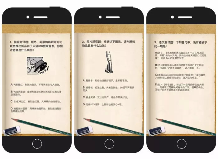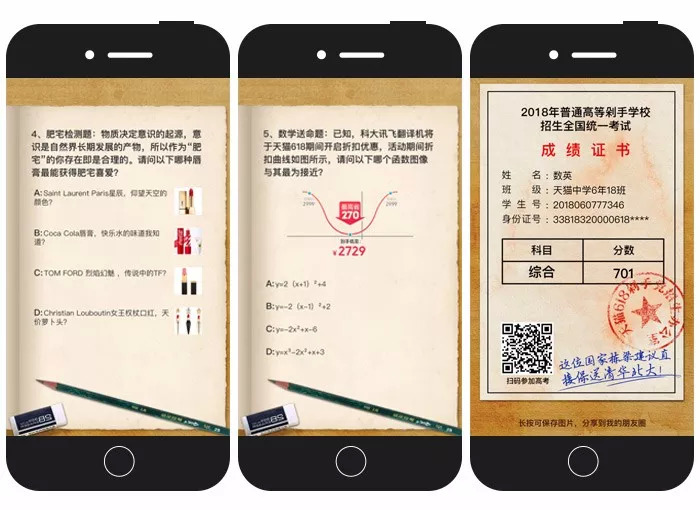 以高考为切入点,天猫为“剁手党”们精心安排了一场考试,试题涵盖常识、数学、物理、创想、时事热点等题型,每一题都涉及到了至少一个品牌/产品的相关信息。美中不足的是,这个 H5 对妹子来说难度不大,但直男做起来可能一路红灯。不过好在分数并没那么重要,玩起来有意思、愿意分享才是重点!