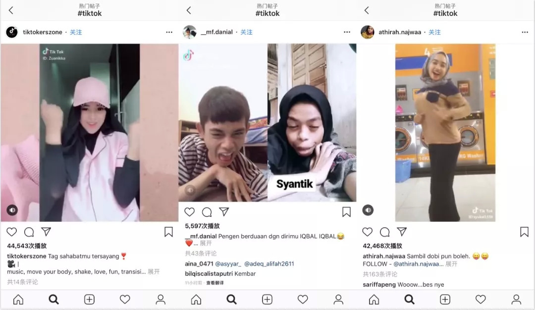 在Instagram上,以Tik Tok为标签进行搜索,会找到上百万加了#Tik Tok的帖子,很多热门帖子的播放量达到了四五万次,这些视频在Instagram形成了相对繁荣的内容生态,尤其是来自马来西亚、印度尼西亚的用户群。