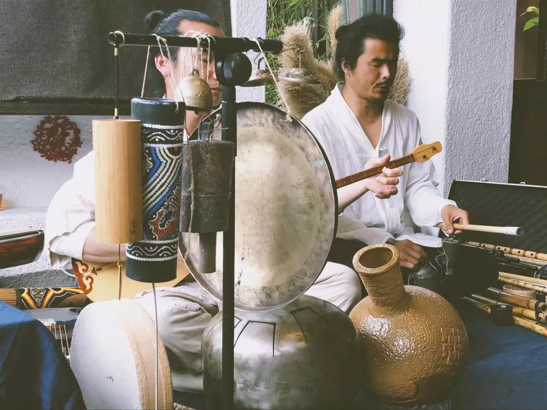 演出的音乐人是阿坚和子枫。他们的发型和着装都是古代人的样子,在地上盘腿而坐。我和李老师选择了第一排想看得更清楚些。环顾四周,大家都身着朴素的扎染或棉麻服饰,背部打得笔直,盘腿而坐。而我和李老师,一个休闲风,一个运动风。我揉着发麻的双腿想伸长打直,李老师则翘起了二郎腿。